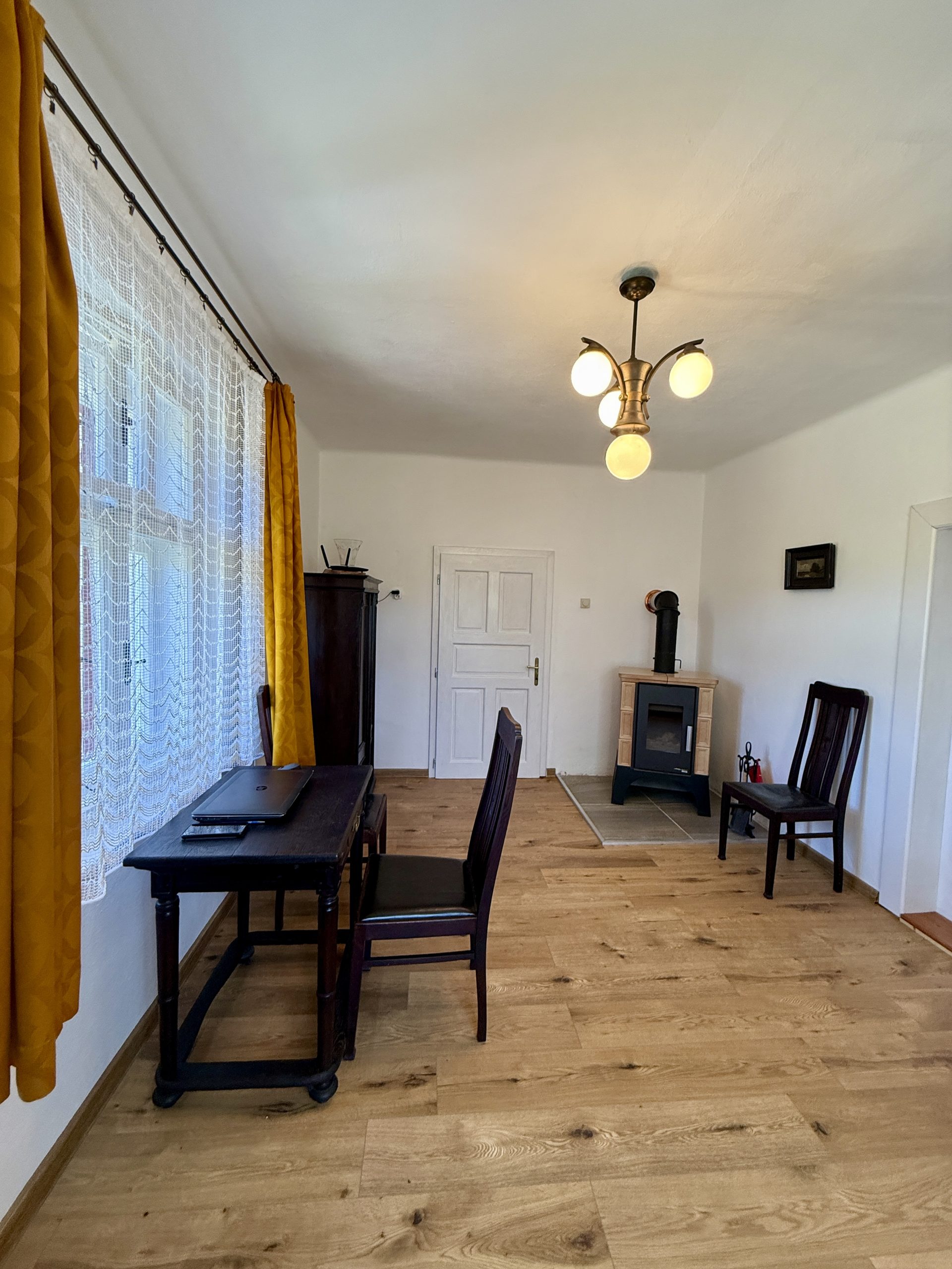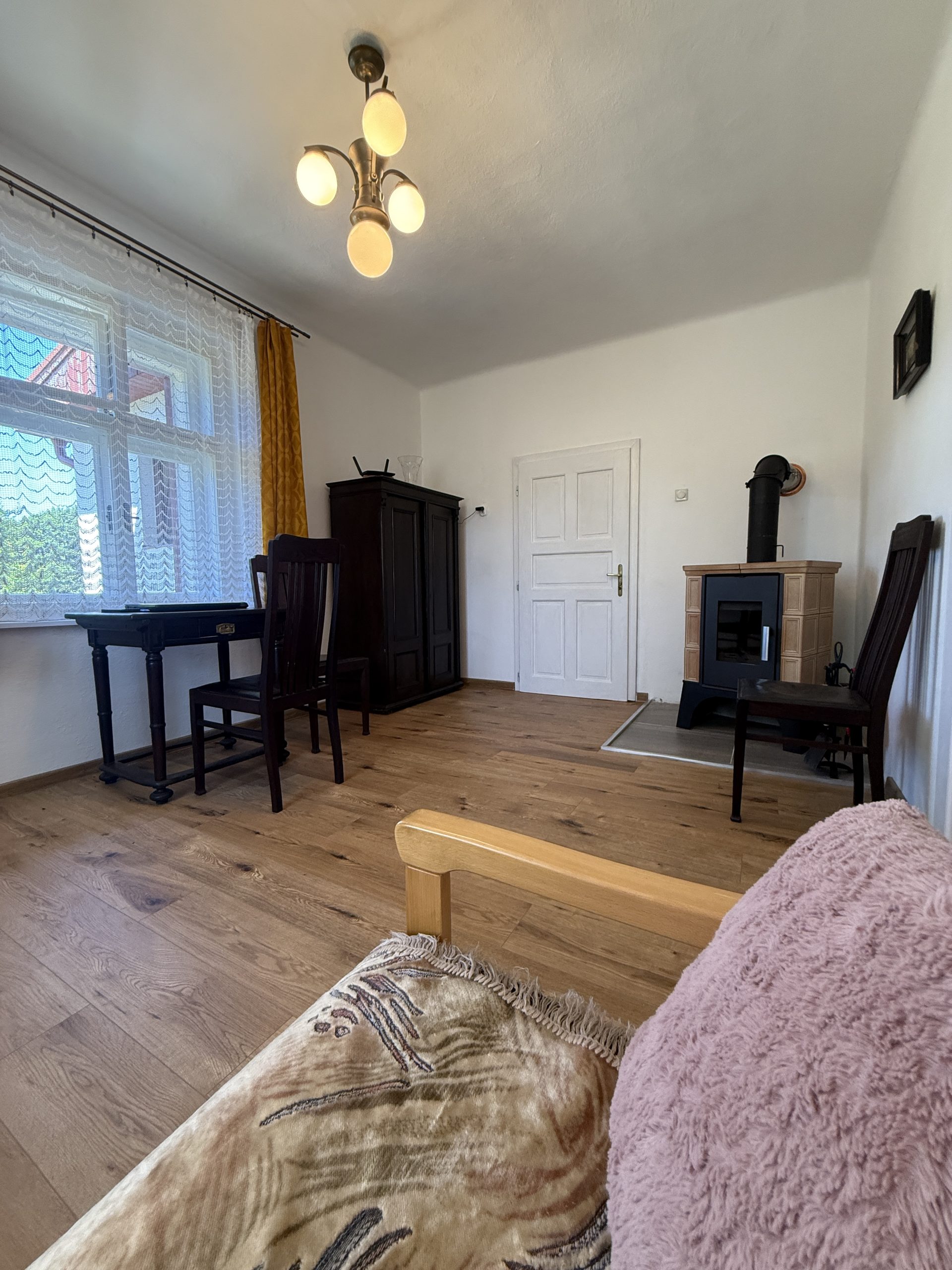 Vytápění objektu je ve dvou kamnech na dřevo + elektr. radiátory + podlahové topení. K dispozici vám bude kuchyně s originálními kachlovými kamny, elektrickým sporákem, troubou, lednicí, jídelním stolem, kuchyňskými potřebami, rychlovarnou konvicí, mikrovlnnou troubou a kuchyňským koutem.